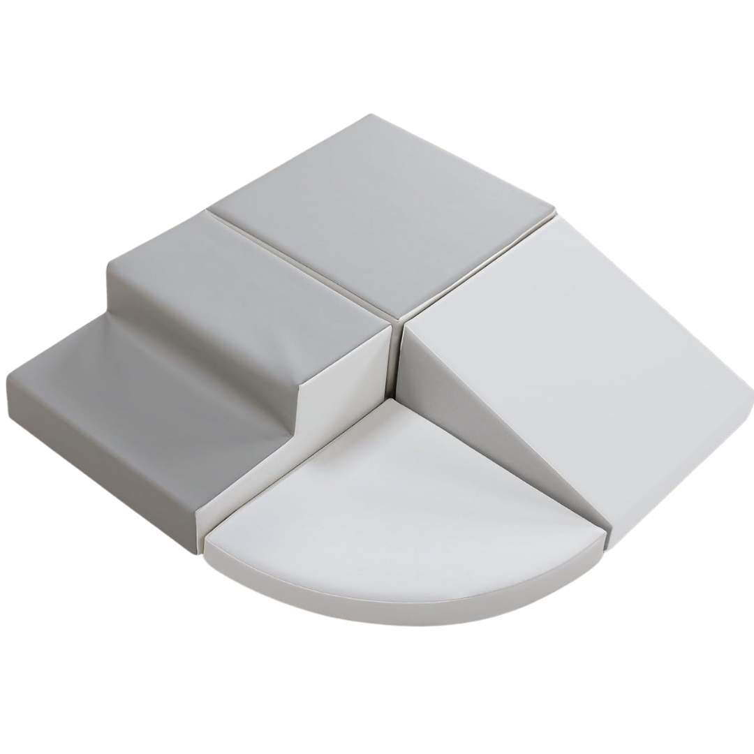 - Structure: four connected pieces including a ramp, step block, flat block, and quarter-circle base
